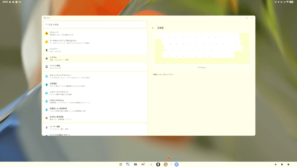 一方文字入力についてはGboardは問題ないものの、ATOKは日本語と英数の切り替えができません。設定を見るとGboardは日本語109A配列が指定できているのに対し、ATOKはデフォルト設定でキーボード配列を選べません。この動作は以前もAndroidでキーボードを使うときに起きていたので、今後ATOK側で対応してくれることを期待します。