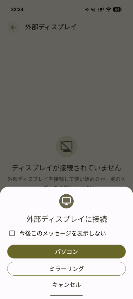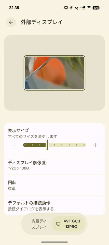 ディスプレイ設定はディスプレイモードではなくスマートフォン側で操作。設定アプリの「接続設定」「外部ディスプレイ」で解像度や表示サイズを変更できます。