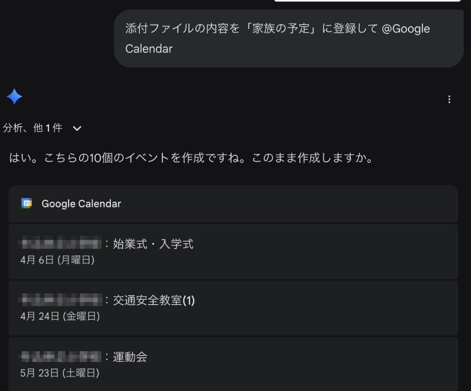 サッカーの練習のほかにも、新年度で子どもの小学校からは年間予定が配布されますが、この登録もスキャンしたデータをGeminiに読み込みさせて「家族の予定に登録して」と頼むだけで完結します。