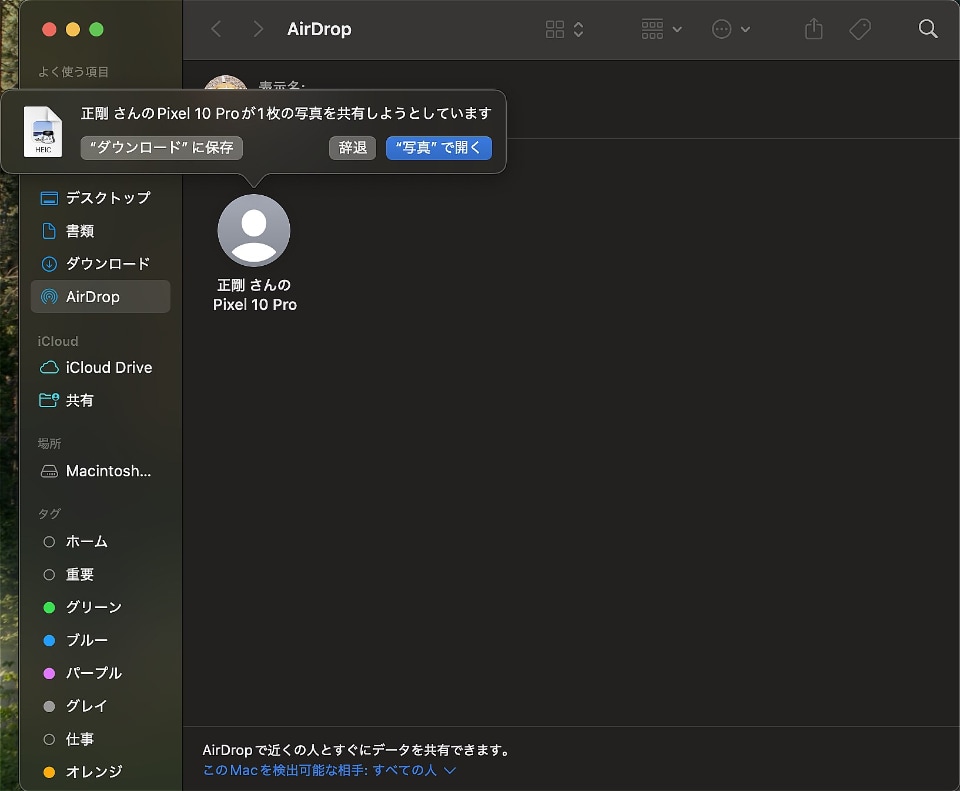 AirDropはiPhoneだけの機能ではありません。iPadにもMacにも搭載されています。つまり、Pixel 10 ProからQuick Shareを使って、Macにも写真や動画が送れるわけです。それはグーグルが公表していたことですが、筆者は最近まで失念しておりました。