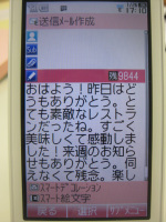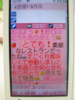 中でも面白いのは、メール作成において簡単にデコメが作れてしまう「スマートデコレーション機能」。使い方は説明するまでもないのですが……通常どおり文字を打った後に、メールキーをひと押しするだけ。すると自動的に文末に絵文字が挿入され、背景色や文字色が変換され、ポップなメールへと早変わりするのです。デコメを作るのは楽しいのですが、時間が無い時だと億劫なこともありますよね。かといって、キラキラ華やかなメールを送ってくれる友人にそっけないメールを返す訳にもいかず……。そんな時、この機能が素晴らしい効力を発揮してくれます!