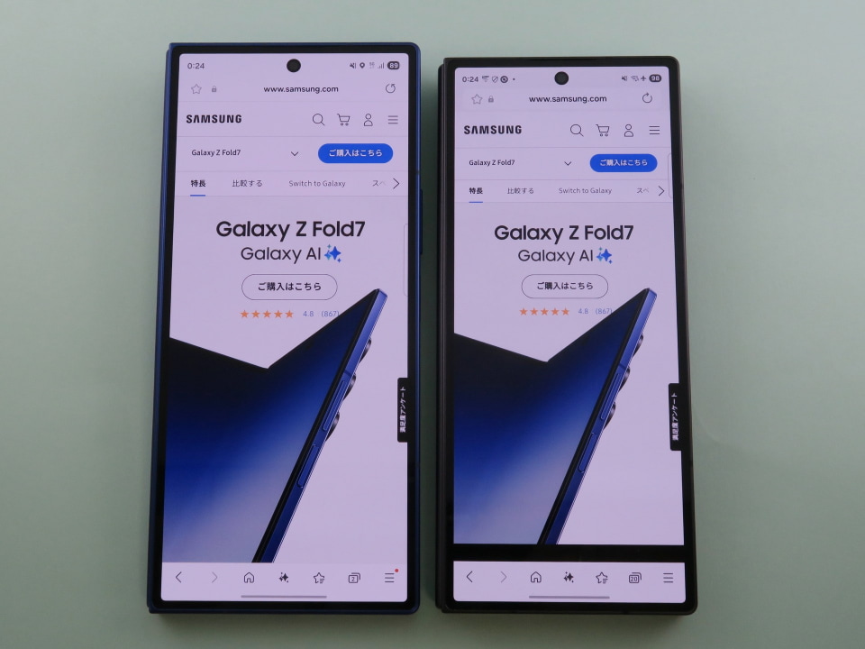 「Galaxy Z Fold7」は軽量スリム化に伴い、ボディの形状が変更され、ディスプレイもメイン/サブ共に、対角サイズが大型化されている。
