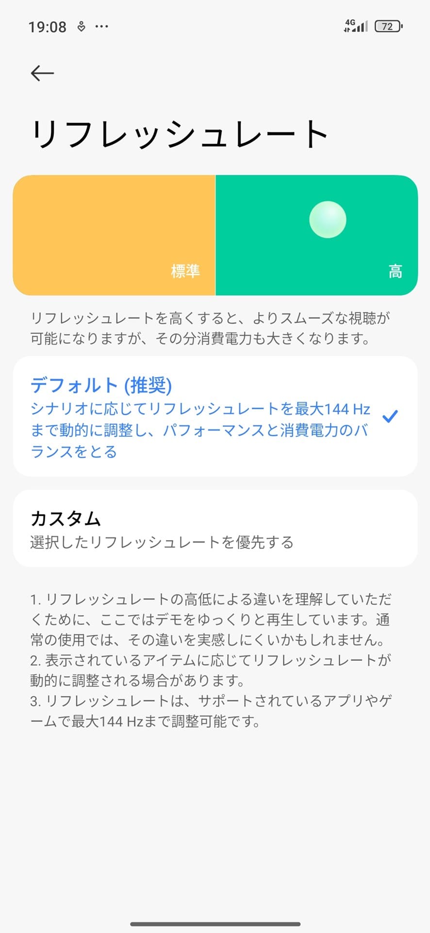 ディスプレイは2340×1080ドット表示が可能なフルHD+対応6.9インチの液晶ディスプレイを搭載する。コントラスト比は1400対1、輝度は標準で700nits、直射日光などの高輝度化のHBM(High Brightness Mode)輝度は850nitsで、リフレッシュレートは対応アプリを利用する場合、最大144Hzに対応し、タッチサンプリングレートも最大288Hzと十分なレベルにある。