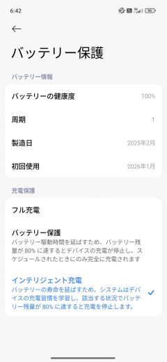 バッテリーは6300mAhのシリコンカーボンバッテリーを採用し、45Wの急速充電にも対応する。ワイヤレス充電には対応しないが、最大22.5Wでの有線によるリバース充電に対応する。本体はフル充電の状態で最大27時間のビデオ再生、最大108時間の音楽再生が可能とするほか、マイナス20度の環境下でも安定した動作が可能だとしている。シリコンカーボンバッテリーについては「Redmi 15 5G」のレビューでも説明したが、リチウムイオンバッテリーの一種で、通常のリチウムイオンバッテリーが負極に黒鉛やグラファイトを用いるのに対し、シリコンとカーボンの複合素材を採用することで、高いエネルギー密度を実現している。