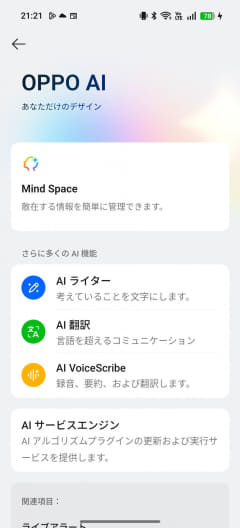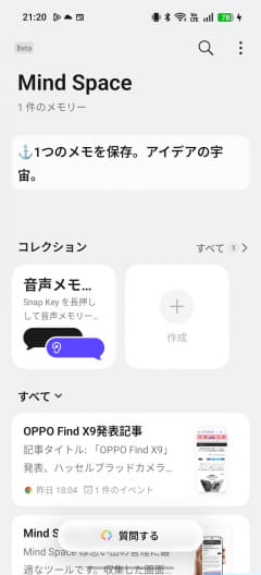 また、AIを利用した機能のひとつとして「AIマインドスペース」が搭載される。三本指を下方向にスワイプしてスクリーンショットを撮ったり、本体左側面のSnap Keyを長押しして音声メモを記録したりできる。Snap Keyを短押しすると、AIが表示画面を分析し、内容に応じたタグ付けをして分類する機能になる。
