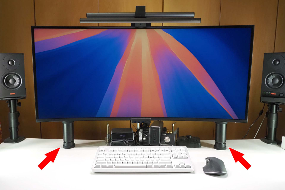 だが、コトはそう容易に運ばない。というのは、このディスプレイは幅が約95cmもあり、それを中央の1本脚のスタンドで支えているので、デスクに振動が加わるとディスプレイも揺れてしまうのだ。それを防止するために「揺れ防止のための脚」を2本追加してディスプレイを支えている。