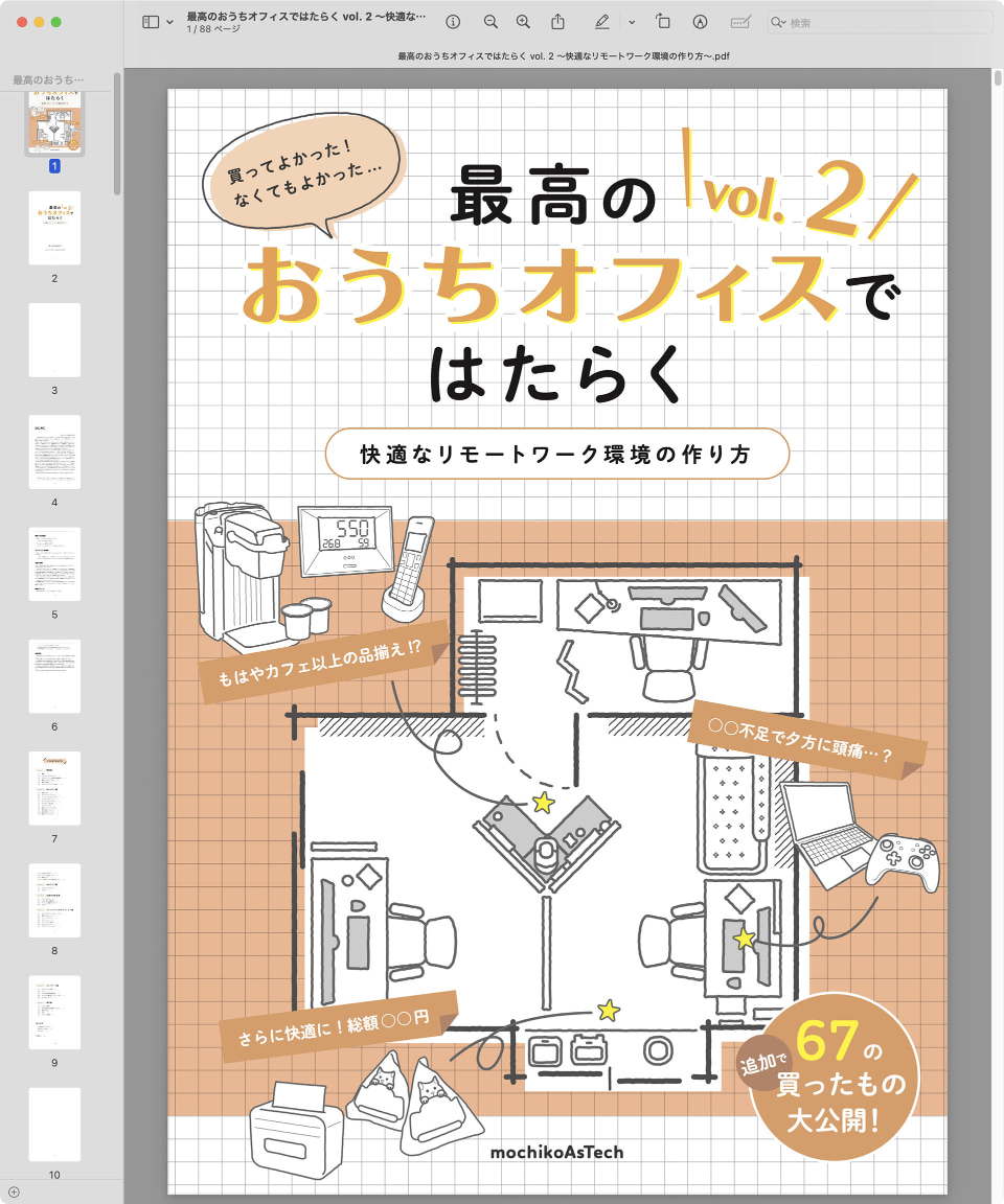 ディスプレイの高さを……とアレコレ考えていて思い出したのが、先日いただいた「薄い本」。mochikoAsTechさん著の「最高のおうちオフィスではたらく ~快適なリモートワーク環境の作り方~」という本だ。