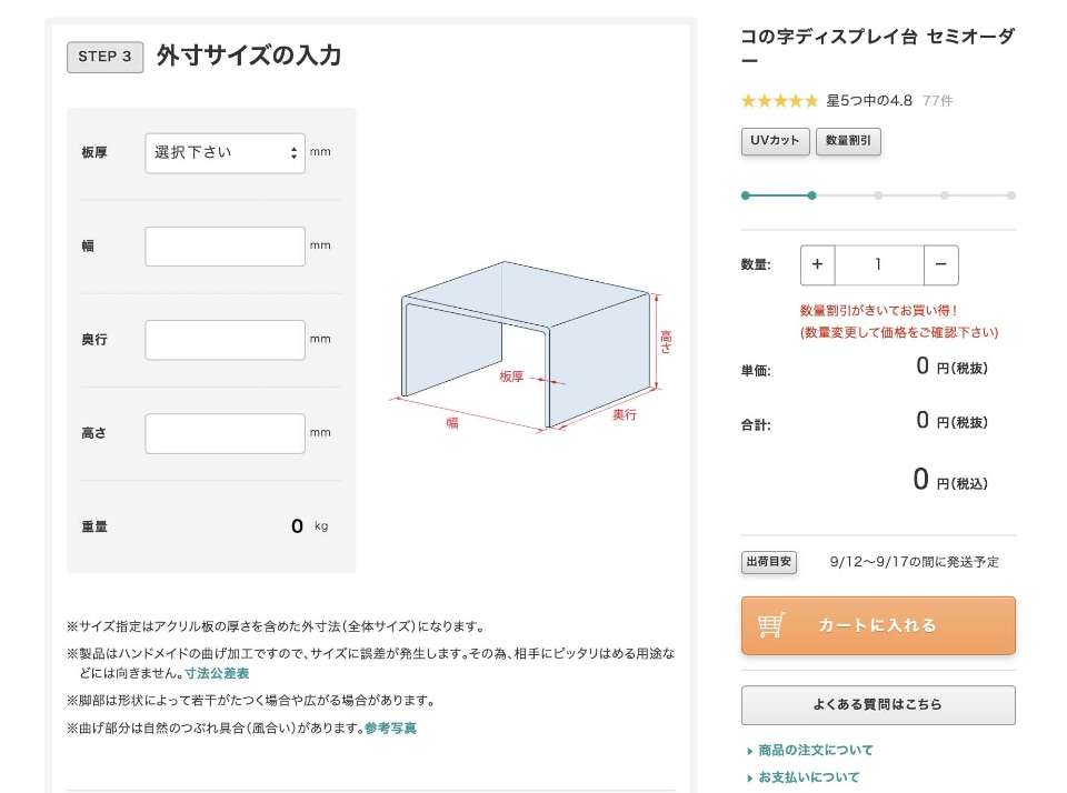 欲しい「コの字ディスプレイ台」のサイズを入力してセミオーダー!