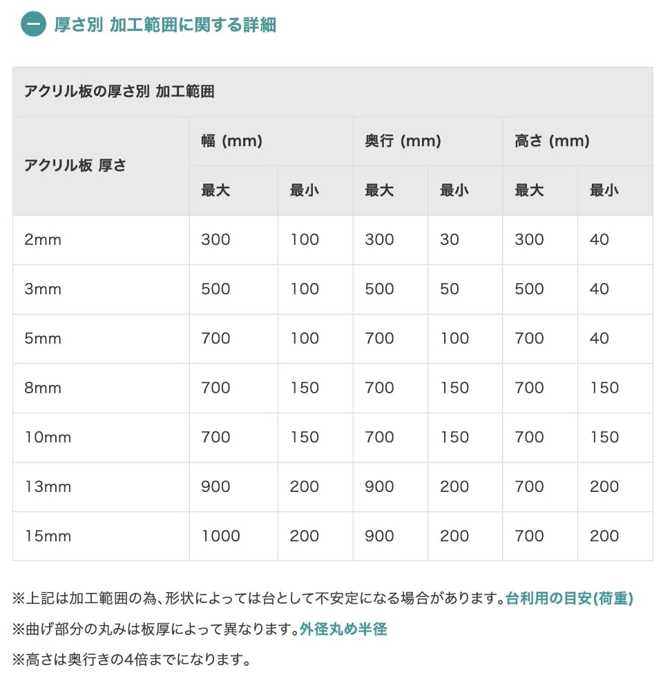 で、以下が、アクリル板の厚みに応じた最小・最大サイズ表だ。