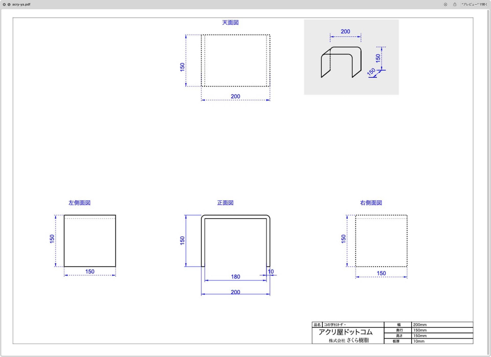 俺の場合、高さと奥行きを15cmくらいに抑えたいので、その範囲で最も強度が高いと思われる10mmのアクリル板を選んだ。そんなふうにして必要なサイズの「コの字ディスプレイ台」を決めていく。注文時にはセミオーダーした図面をPDFとしてダウンロードすることもできる。