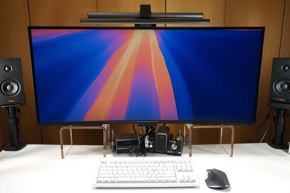 う~ん、ディスプレイの高さをもう少し上げたい……かも。ディスプレイはDell「U4021QW」を使っている。解像度が5120×2160ドットの40インチ・曲面ディスプレイだ。