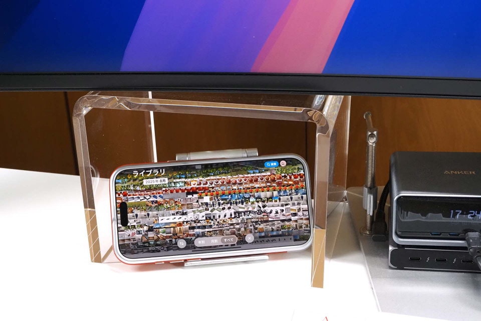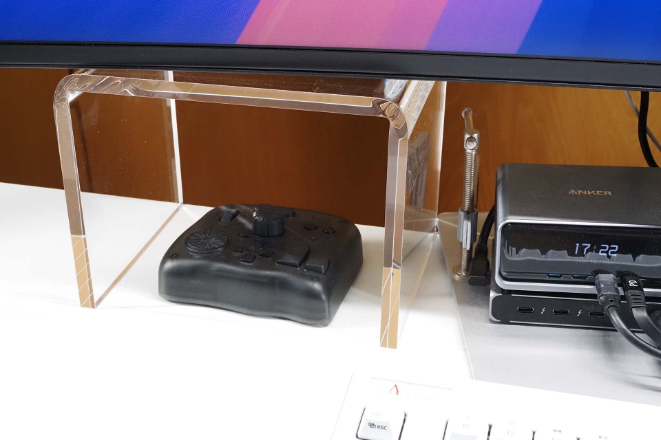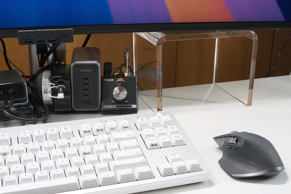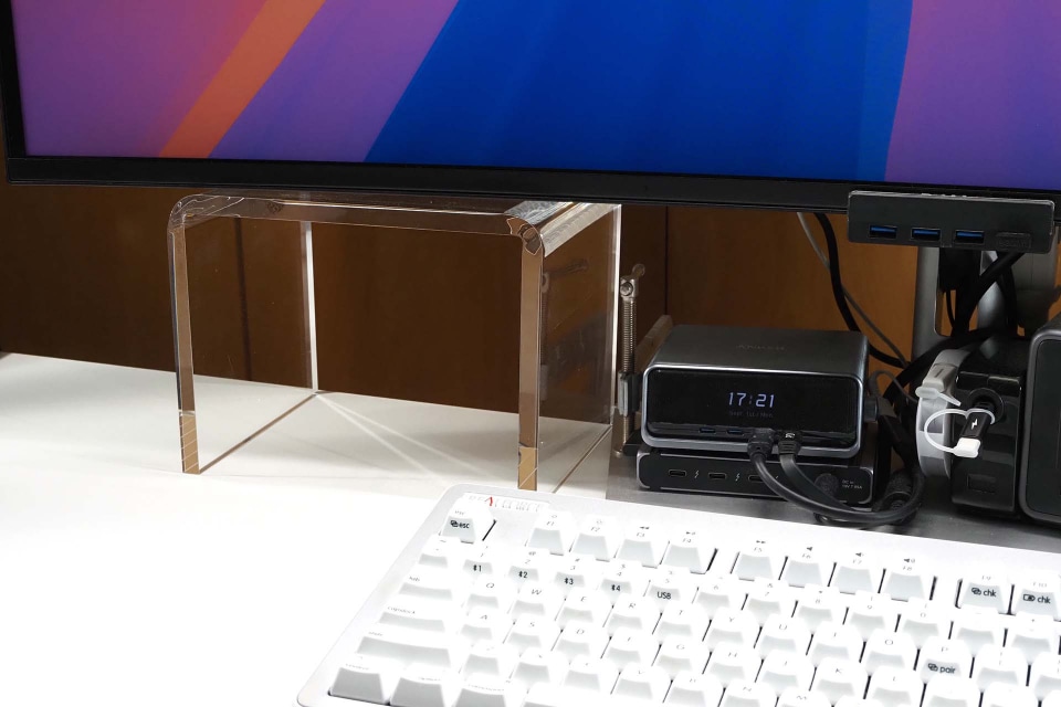 その後、この“ディスプレイ脚”をしばらく使っているが、コの字型なので、その空間にちょっとしたモノが収まって、なんかイイ感じ。ディスプレイの下の空間を、より積極的に活用する気にさせるみたいな、そんなスペースが生まれるのだ。