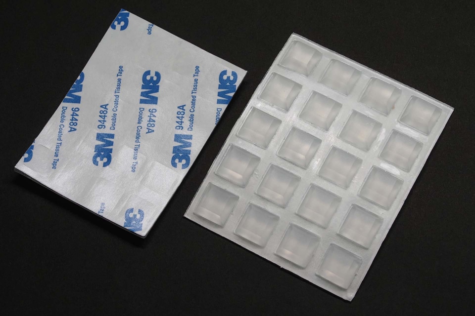 その後、2つのコの字ディスプレイ台にそれぞれ透明ポリウレタン製の滑り止め足を貼り、盤石な安定感とした。……あの透明の滑り止め足って何て言うんだろーと思っていたら、「3M バンポン プロテクティブ製品」らしい! まあ類似品も多々あるが、滑り止めになりつつ防振にもなって便利っすわ~。