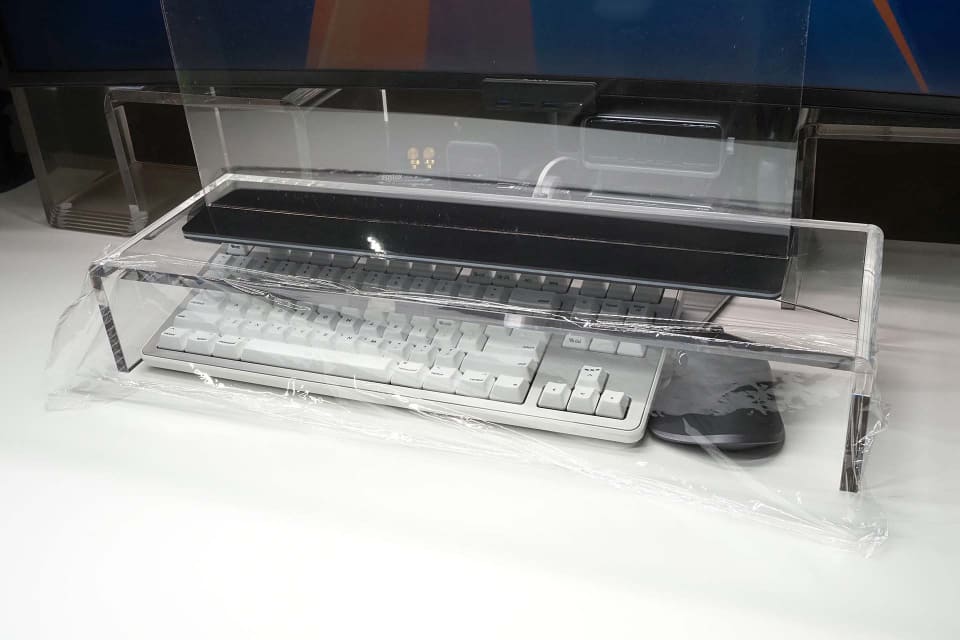 具体的には、上記のアクリルフレームをキーボードラックの上に乗せ、キーボードラックの下にキーボードとマウスを格納してしまう。キーボードやマウスの汚れ防止は、キーボードラック前方をラップなどで軽く覆うか、あるいは紙などで軽くガードすればいい。