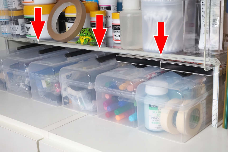 だが、そのオーダーミスのキーボードラックも、しっかり役立ってくれている。棚に置き、棚の空間を分割するカタチで使っている。