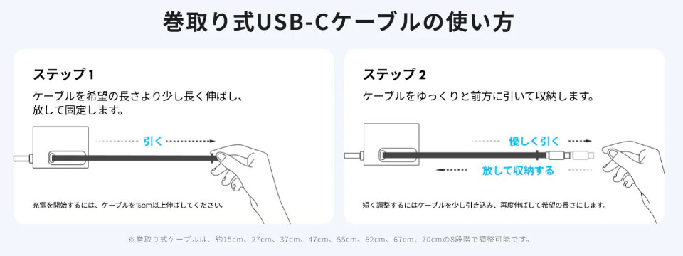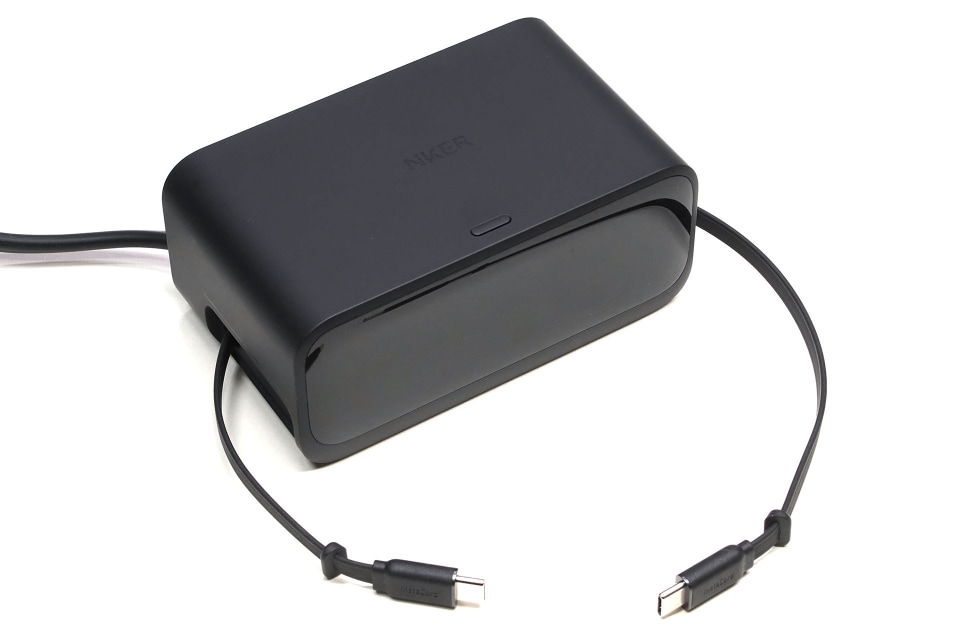 Anker Nano Charging Stationには2本の給電用・巻き取り式USB Type-Cケーブルが内蔵されている。ケーブルは最長70cmまで引き出せて、「引き伸ばす」、「軽く引いて戻す」などの動作で約15cm、27cm、37cm、47cm、55cm、62cm、67cmの長さに調節することもできる。