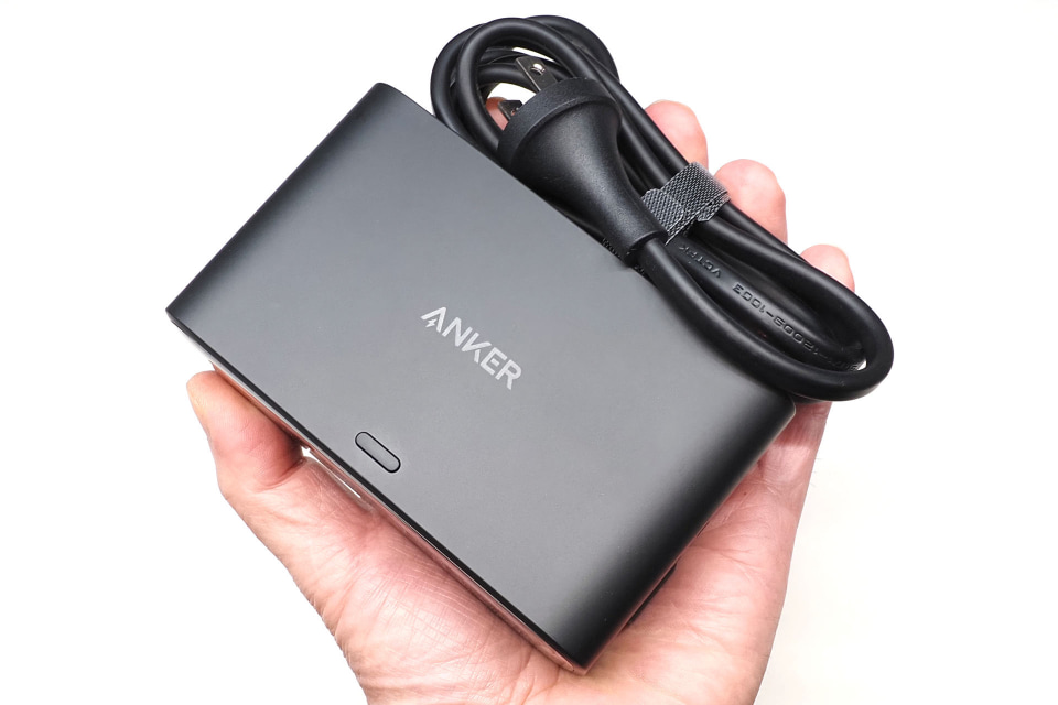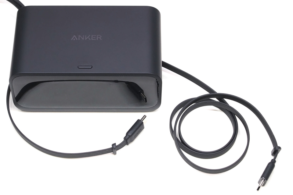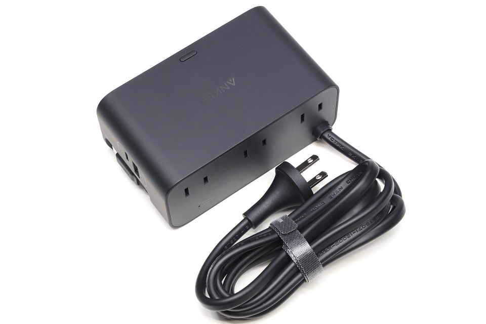 まずサイズ感から。前述のとおりAnker Nano Charging Stationの大きさは約121×73×53mmで、重さは約570g。電源ケーブルは直結式だが、ケーブルはやや細めで面ファスナー式の結束バンドが付属している。