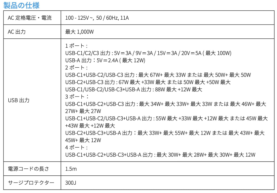 USB出力は最大100W、マルチタップとしては最大1000Wまで使える