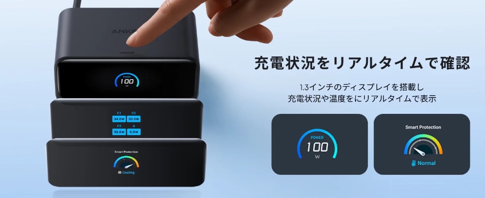 また、本体前面にはディスプレイが内蔵されており、各ポートからの出力がリアルタイムで数値表示される。またこの表示とデバイスの表示を見ている限り、複数のデバイスをつないでいった際に出力の瞬断が起こることもない。
