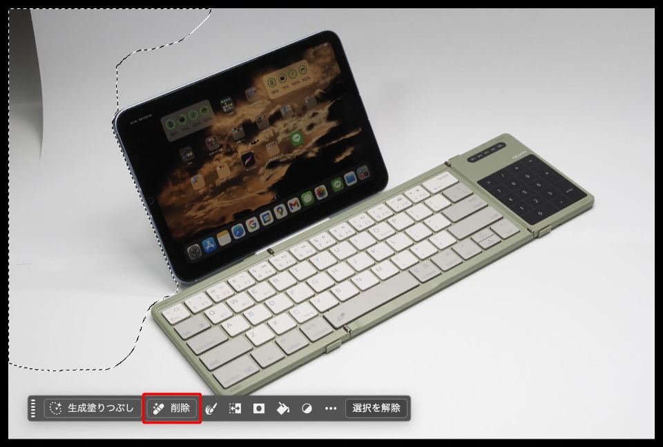 商品撮影をするたびに超スーパー激アルティメット便利に活用しているのが、Photoshopの「削除」機能である。消したいエリアを範囲選択して「削除」をクリックするだけで、たいていのモノがキレイに消えちゃうという、AIによる機能だ。