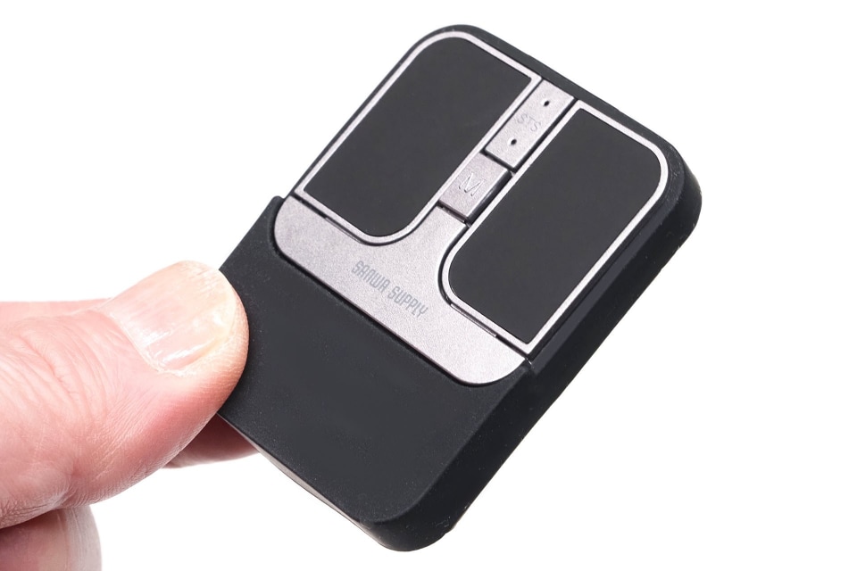 「400-MAWB216シリーズ」(以下、MAWB216)の大きさは前述のとおり約縦4.3×横3.6×厚さ0.88cm。いろいろな意味で笑ってしまうほど小さく薄い。「こんな小さいのをよく作ろうと考えたな(笑)」とか「ここまで小さくしなくても(笑)」とか「この発想はないなあ(笑)」などなど。