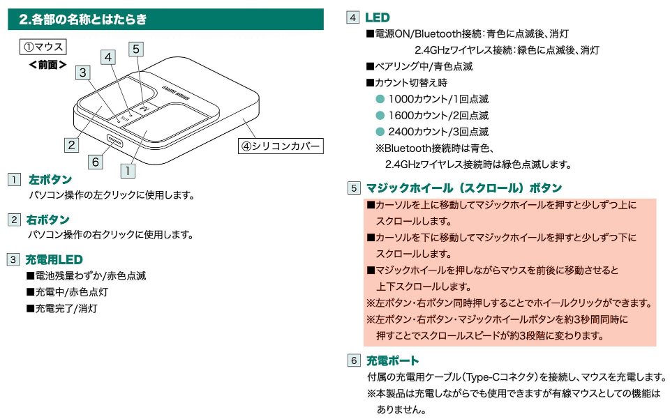 また、マジックホイールボタンをクリックすると、最後のマウスポインター移動方向への短めのスクロールを行える。マジックホイールボタンの機能は以下(説明書)のとおり。
