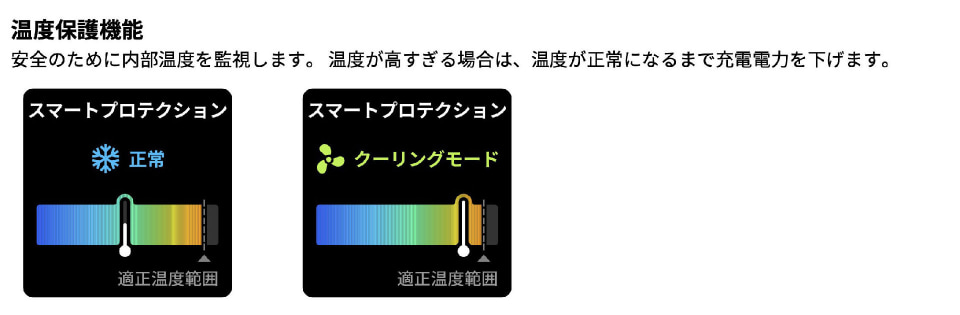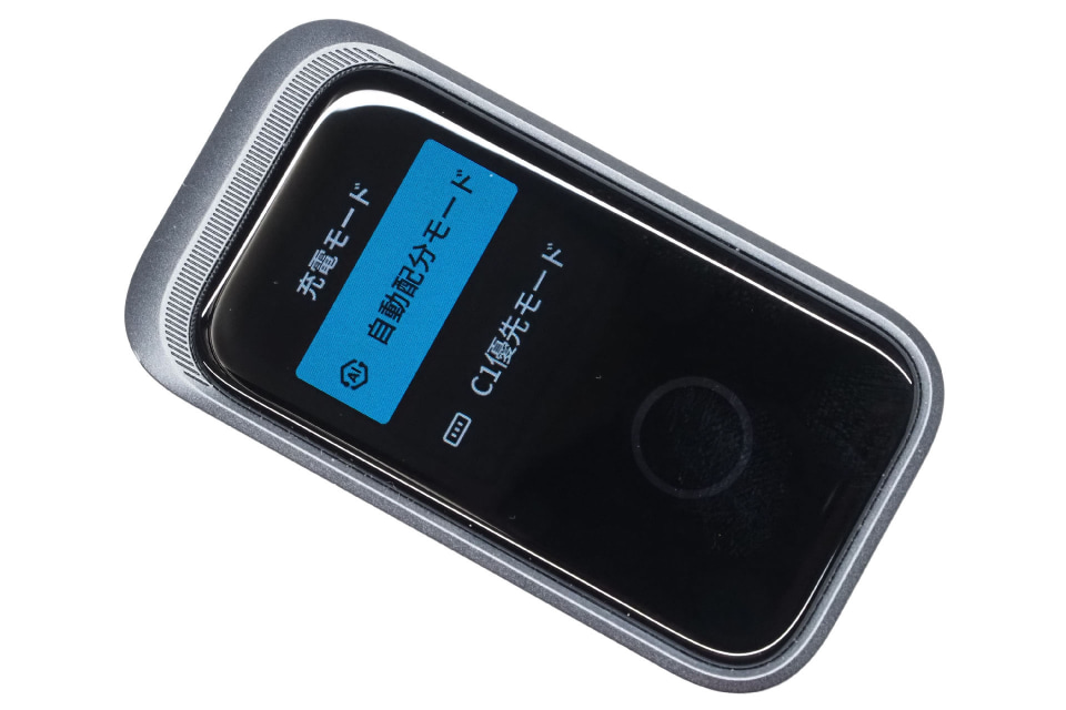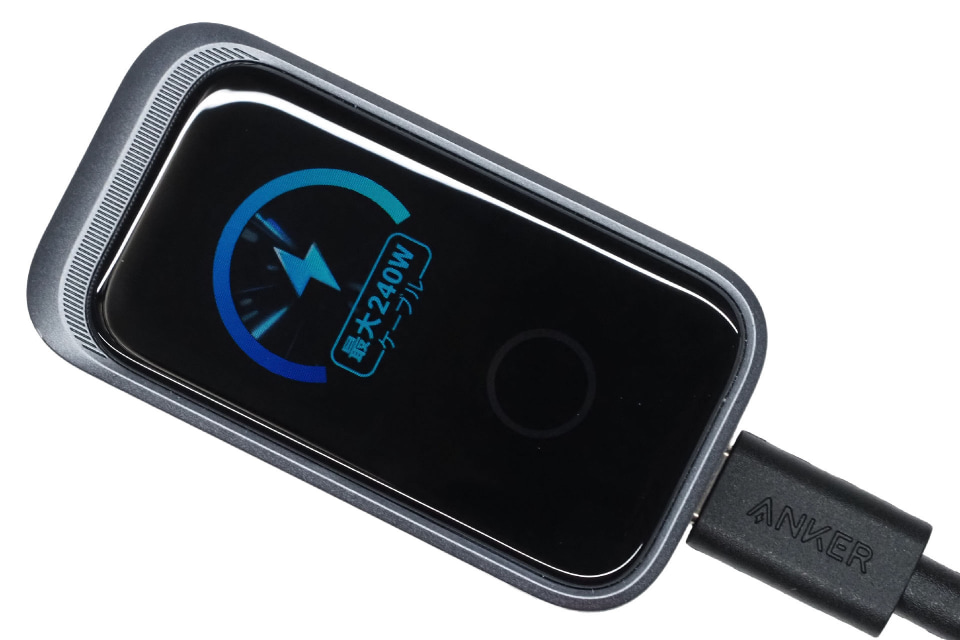 その最たる要素がタッチ式ディスプレイ。ディスプレイにはリアルタイムの給電状況や本体の温度など各種データが表示され、タッチで表示を切り替えることができる。また、表示が正しい向きになる自動切り替えに対応していて、充電器をどの向きでACジャックに挿しても、正しい表示に自動で切り替わる。またこの表示はタッチ操作で任意の向き(4方向)に切り替えることができる。