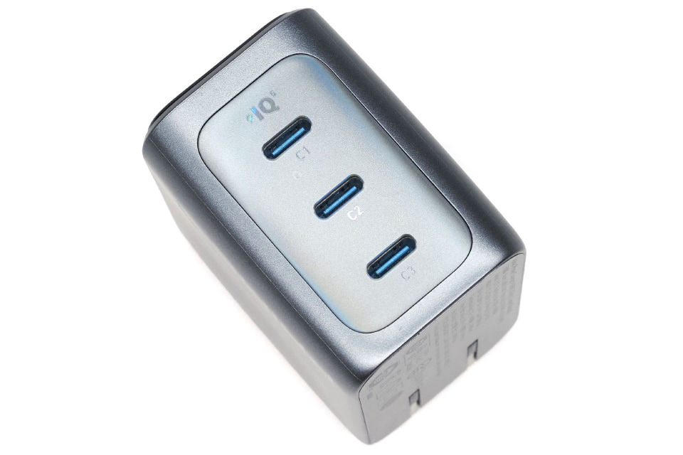まずはAnker Prime Charger (160W, 3 Ports)の基本的な仕様から。給電用USB-Cポート×3を備えたUSB急速充電器で、合計最大出力は160W、サイズは約65×52×35mmで、重さは約220g。前述のとおり、この出力の携帯向け多ポートUSB急速充電器としては世界最小クラスだ。