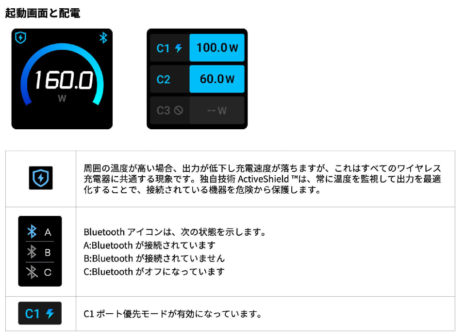 Anker Prime Charger (160W, 3 Ports)の画面は小さいものの、表示される情報の種類が多く、都度役立ったり興味深く観察したりできる。以下、その表示例を説明書から抜粋しつつご紹介したい。