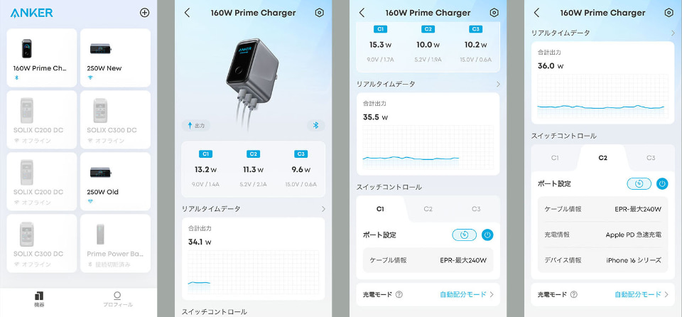 以下、Ankerアプリのスクリーンショットとともに、Anker Prime Charger (160W, 3 Ports)の機能性などをご紹介したい。