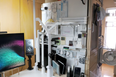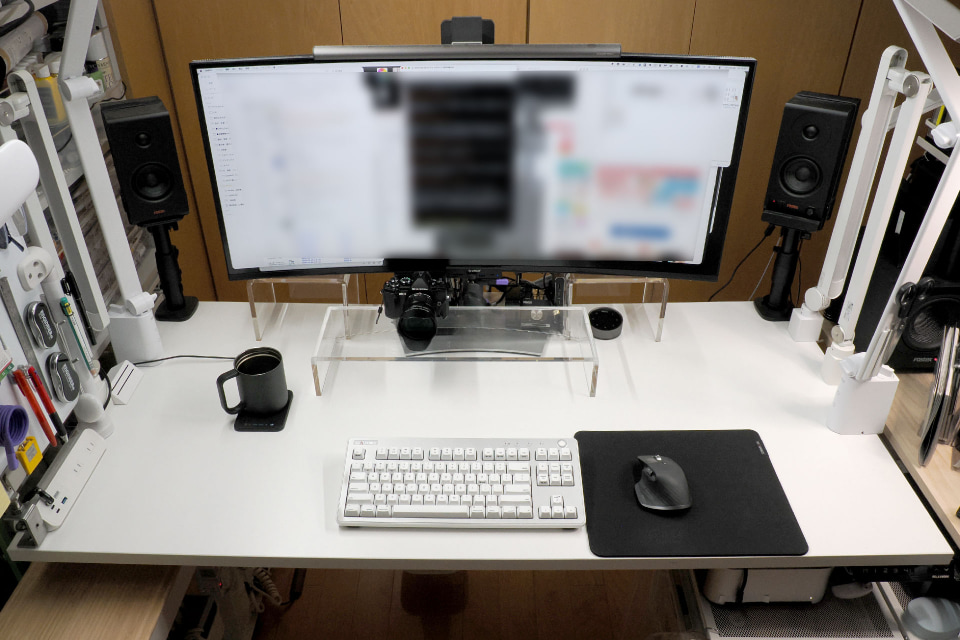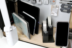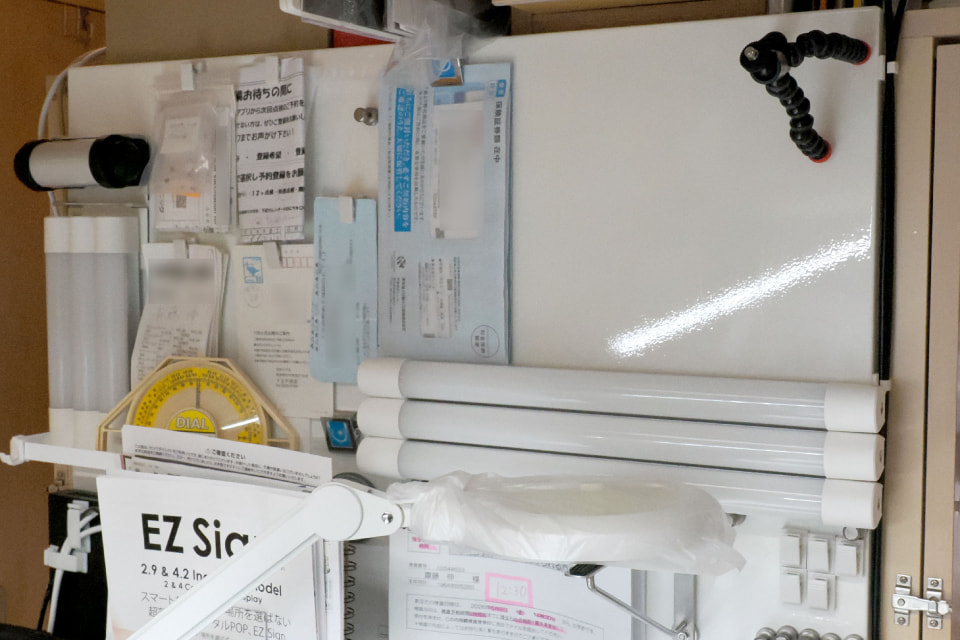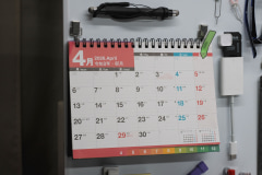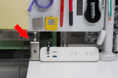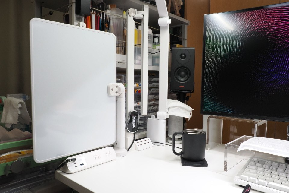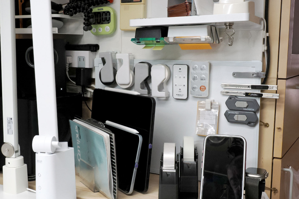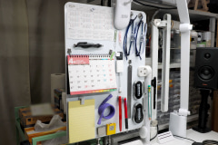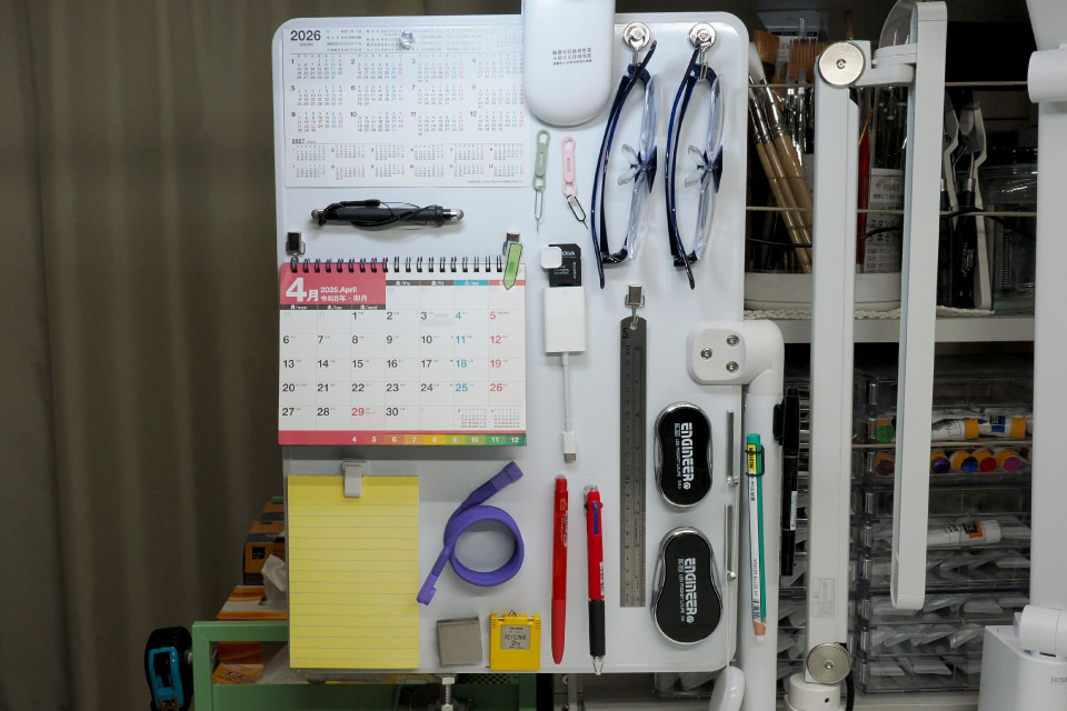 いろいろなモノをマグネット吸着させているボードはサンコー「360度自由自在クランプ式ホワイトボード」の「大」サイズ。直販価格6,680円。デスク左側にセットしている。 さすがにこれだけモノを吸着させると「クランプ1カ所固定のホワイトボード」だと傾いてしまう。ので、傾き防止のために小さなクランプを支えとして使っている。 クラウド上のカレンダーも使っているが、紙のカレンダーも使用中。重要な予定はクラウドのカレンダー加え、紙のカレンダーにも記入して備忘としている。毎日使うものだが、机上に立てると邪魔。だが「空中収納」すると邪魔でないし視線が届きやすい位置に置けて超便利。 メモの類も「空中収納」。机上に置いておいたほうが「すぐ使える」のだが、メモを取ることがあまり多くない俺なので、「すぐ使える」より「ワンアクション必要だが机上スペースを占有しない」という利便を取って「空中収納」している。 カレンダーやメモへの書き込みにはペンが必要。ペン類にはマグネットのグッズを追加して「空中収納」している。ペン立てが不要になって超スッキリ! そしてペンを手に取りやすくて便利♪ 使用頻度が低いペン類も「空中収納」。サンコー「360度自由自在クランプ式ホワイトボード」の支柱部分はスチールなのでマグネットが吸着する。それを利用して油性マーカーとペン型消しゴムを「空中収納」している。 ルーペや定規も「空中収納」。上記の使用頻度が低いペン類もそうだが、使用頻度が低くても週に何度か使うようなものは、すぐ手に取れるとイイ。引き出しから取り出して……という少々の手間がなくなり、即使えるので、時短になりかつストレス減にもなって快適。 メガネ型ルーペも「空中収納」している。使えば非常に便利なメガネ型ルーペだが、ケースに入れてしまっちゃうと「出すと面倒だから普通のルーペでいいや」となってツールの持ち腐れになりがち。「空中収納」するとすぐに使えてツールの価値をしっかり発揮させられる。 仕事柄、ケーブルや巻き尺の類は多用する。こういう小物も「空中収納」にすると必要時に即座に使えて効率的。面倒くさがらずに使えるので気分もイイ。 たまーに使うSIMピンも「空中収納」。後述の市販グッズを使っているが、SIMピンを探す手間がなくなり、手が滑って小さなSIMピンを落とすことも軽減できる。 小型のLEDライトもボードにクリップ止めしている。「空中収納」ではないのだが、カレンダーや付箋などを照らして内容を読みやすくするためだ。このボード、昼間は逆光となり、吸着させた紙などの文字が読みにくいので、LEDライトを使っている。 デスク右側にはスチールパネルと、そのスチールパネルにマグネットで固定したホワイトボードがある。いろいろ吸着し放題で「空中収納」しまくり。 デスク右側上方のスチールパネルは、着座位置からやや遠いので、近々必要になりそうな書類あたりを吸着させている。また、たまに使うツールなども吸着。「空中収納」ですぐに手に取れるようにしている。 デスク右側下方は、着座しつつぎりぎり手が届く位置。よく使うリモコンやツールなどを「空中収納」している。カッターナイフやマスキングテープは毎日のように使うが、「空中収納」しておくとデスクが散らからずに好都合&実用的なのだ。予備のSIMなんかも「空中収納」しておくと「あれぇ?予備SIMどこに片づけたっけ??」みたいなコトがなくなる。 この位置にはペンスタンドがあったが、ペン類は「空中収納」したためにペンスタンドは撤去。ペンスタンド置き場がタブレット置き場になった。 こちらはデスクライトのアーム部分にマグネットテープを貼り、そこにハサミなどの文具を吸着させて「空中収納」しているもの。多用するツールを手に取りやすい位置で「空中収納」するとヒッジョーに快適になる。 結果、デスク上がとてもスッキリした。小物をほとんど置いていない状態となった。 写真のようにデスク上にはディスプレイ、キーボード、マウス、コーヒーカップとカメラくらいしか置いていない。だが、メモを取るとか、定規やカッターを使うとか、メガネ型ルーペを使うとか、カードリーダーを使うとかいう場合、左か右に手を伸ばせばそれぞれのツールを即手に取って使える。机上が広々空いているので、いつでも作業を始められる。「空中収納」にすると、モノへのアクセスが容易になりつつ、机上などのスペースを極めて有効に活用できるようになる。