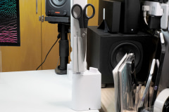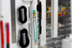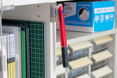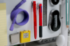 マグネットを容易に貼れるモノなら、簡単に「空中収納」できるようになるが、そうでないモノは? 一工夫必要となる。たとえば、ペンを空中収納しようとすると、その工夫がけっこう面倒だし、できたとしても仕上がりの見栄えがイマイチになったりする。