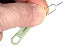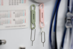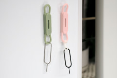 SIMピンによってはグッズへの装着に一工夫必要だが、「空中収納」することによりSIMピンをすぐ発見・使用できて便利。 グッズ部分により「SIMピンを落としにくくなる」という副次的効果もある。 こういう非常に小さなツールは、全部「空中収納」にしてしまうと見つけやすくなり、すぐ活用できて便利だと思う。なお、SIMピンはマグネットに吸着する金属(強磁性体)であることが多いので、こういうグッズを使わなくても「空中収納」できたりする。