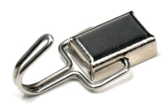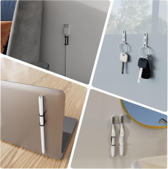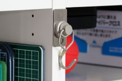 マグネットでスチール面に吸着させて使うフックの類。マグネット部がネオジム磁石だと、小型でも吸着力が強いのでオススメ。 吊るための穴があるモノや、フックに引っかけられるモノなら、マグネット式のフックで「空中収納」できる。 ただし、マグネット式のフックは、吸着面やマグネット吸着力や吊るモノによっては滑って下方にズレたりする。その場合、フック側のマグネット面にビニールテープなどを貼るとズレにくくなる。