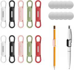 UMUSTブランドの「磁気ペンホルダー」(Amazonで1,299円))。シリコンの装着具にマグネットが内蔵されており、それをペンに装着するとペンの「空中収納」ができるというもの。 クリップ付きのペンに普通につけると、手のひらに当たって書きにくくなったりする。クリップ内側に通すと、ペン芯の出し入れ機構が働かなくなるペンなのだ。 クリップ部分に、こんなふうに装着するのがいいのかも。 XYOFUNブランドの「磁気リモコンホルダー」(Amazonで750円)(https://www.amazon.co.jp/dp/B0DCNHPVK5)。2つのパーツを使い、壁などでリモコンを「空中収納」するグッズだ。 壁やリモコンに貼る部分が柔軟なので、曲面に貼ることも現実的。なんだかんだで多用するリモコンを「空中収納」すると、リモコンの迷子が減り、リモコンスタンドなども不要になり、場合によっては「空中収納」したままリモコンを操作できるので、いろいろ快適だ。 ちなみに、ペンを「空中収納」するグッズについては、小さなツール類の「空中収納」にもよく向く。たとえば俺の場合はSIMピンの「空中収納」に使っている。↓こんな感じ。
