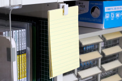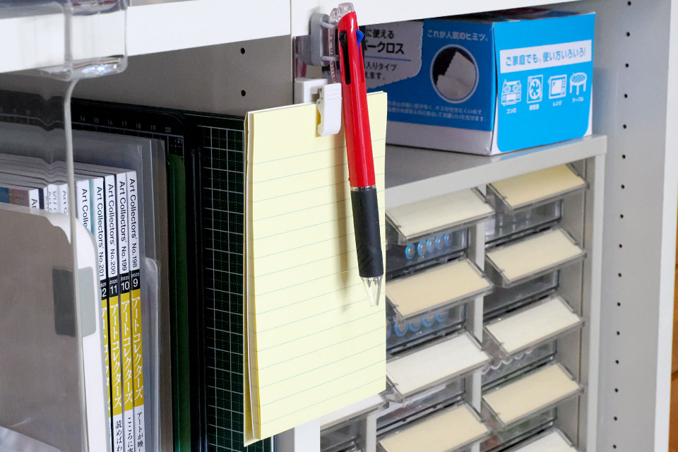いろいろなスチールプレートが売られている。どれもだいたい「壁などにマグネットを吸着させる」という目的のためだ。 鍵束などを吊ることができる。鍵束の「空中収納」である。ってまあ、アリガチな使い方。 ペンとメモ帳を同時に「空中収納」することもできる。 という感じで、スチールプレートを貼れば、いろいろな場所を「空中収納」ポイントにできる。収納するものはアイデアや用途次第でなんでも。キッチンなどではおなじみの方法だが、仕事場でも「空中収納」を積極的に取り入れると探し物や手間が減るし、いろいろな作業がスムーズになり、全体的な効率UPにつながると思う。