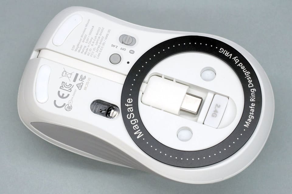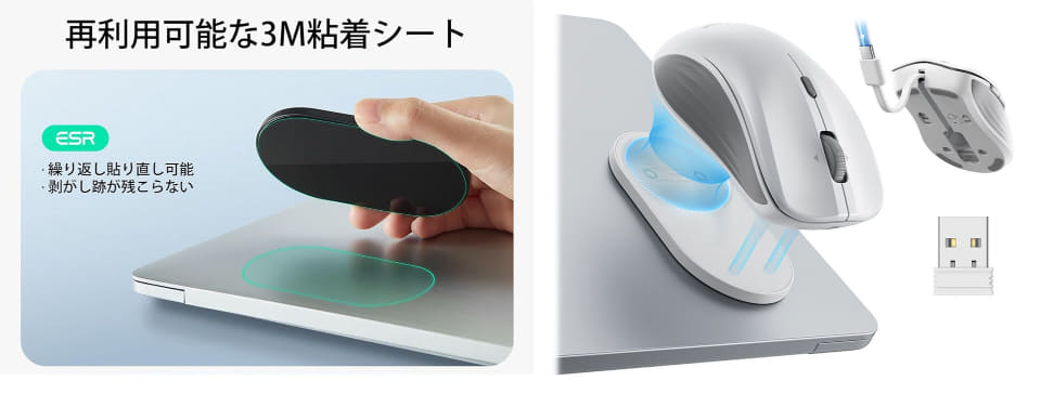 少々前述したが、「ESR MagMouse」はPCの天板などにマグネット吸着できるワイヤレスマウスだ。端末とはBluetooth 5.0および2.4GHz帯USBドングルでのワイヤレス接続。充電式マウスで、45分間の充電で80日間使用可能(1日2時間の連続使用を想定)。