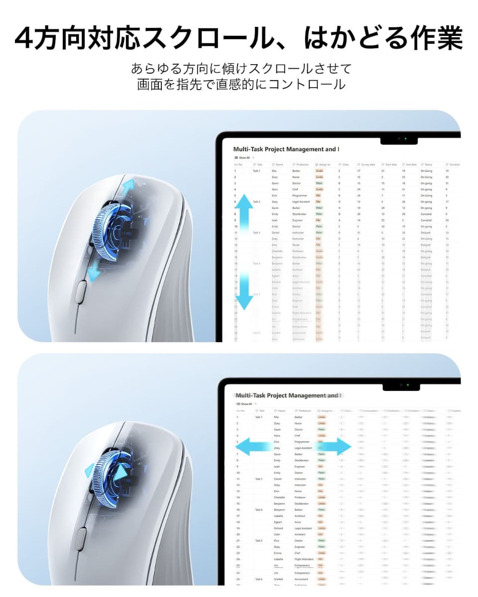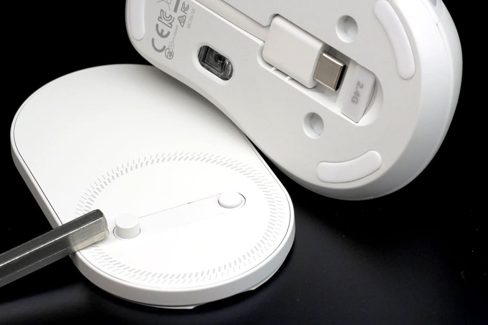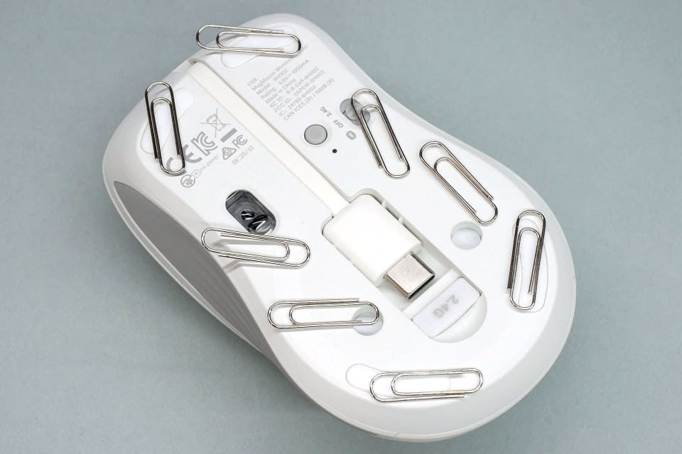 また、充電用USB-Cケーブルが底面に格納されていたり、マウス上部のボタンでセンサーDPI値(マウスポインター移動速度)を6段階で変えられたり、ホイールは上下スクロールはもちろん左右スクロールにも対応していたり、左右ボタンは静音ボタンだったりと、けっこう見どころの多いマウスである。
