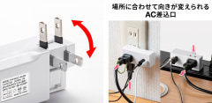 このモバイルタップも、ACプラグが180°自由に回転する。90°の位置にすると6口のAC出力を利用でき、つなぎやすいAC口にACアダプターやACケーブルをつなげられるようになる。AC6口前後のマルチタップも持っているが、このサンワサプライ「700-TAP093W」を使うようになってからは、ACコード長め・AC口多めのマルチタップの出番がかなり減った。このモバイルタップと短めのAC延長コードを使うと、「もうACコード長め・AC口多めのマルチタップ要らないかも〜」という気分になる(が、たま〜に必要になったりするので処分はしていない)。