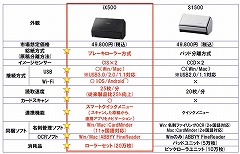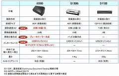 | 左がiX500とS1500/S1500Mのスペック比較表。給紙機構やイメージセンサーが一新され、インターフェイスもUSB3.0とWi-Fi(iOS/Android端末接続用)に対応した。スキャン速度も25%向上している | |