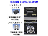 従来機種のS1500/S1500Mでは、原稿を送り出すピックローラーユニットと、原稿が誤って出ないように押さえるパッドユニットが給紙機構部の要であり、また消耗品であった。ピックローラーユニットは給紙10万枚が交換目安。パッドユニットは5万枚が交換目安となっていた。