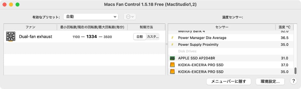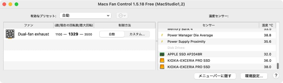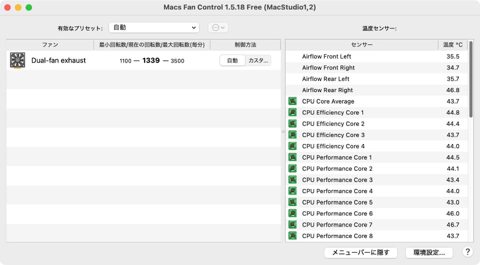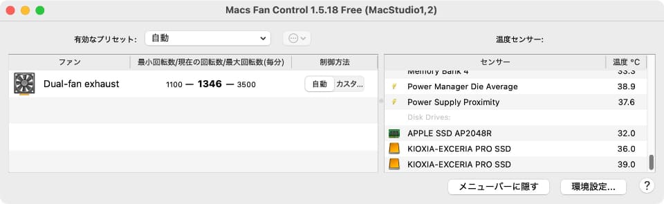 使ったのは「Macs Fan Control」というアプリ。Macの冷却ファンの回転数や温度、ドライブの温度などを表示できるアプリで、ユーザー設定でファン回転数を制御することもできるというアプリだ。