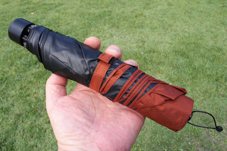 モンベル「トラベル サンブロックアンブレラ 55」は携帯しやすく気軽に使える日傘ではある。だが前出のたためない日傘よりは、使用時にちょっと手間がかかるかなぁ、と。