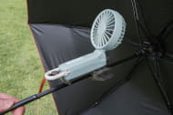 という感じの日傘+ハンディファン。日傘の中棒(シャフト)太さによってはファンがクルリと回ってしまったりするが、まあその場合は中棒を握る手でファンも軽く押さえる、的な? ともあれ、日傘内に風が吹くので、木陰で涼むような快適さがあるのでゼヒ!!!