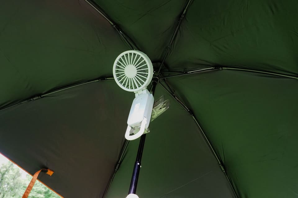 日傘と、それに装着したハンディファン。これらのセットにより、気温40度・炎天下でも俺はキビキビと行動できるのである。