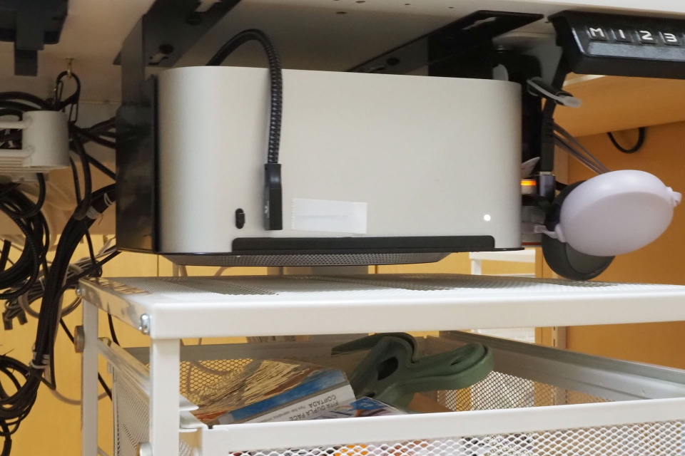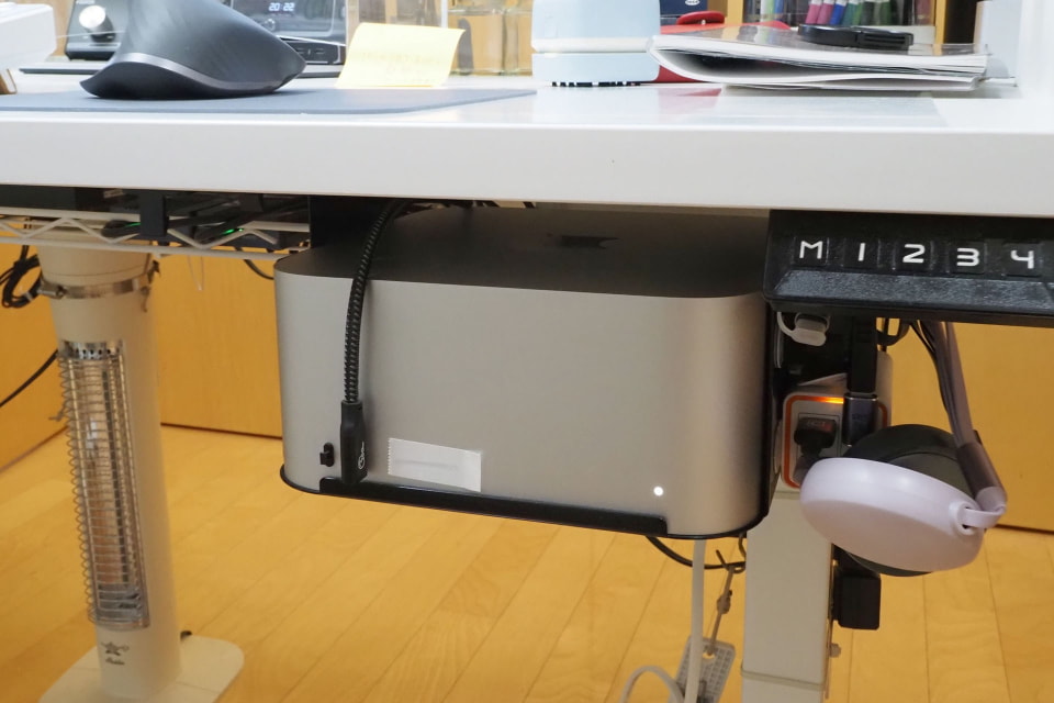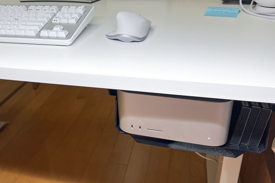 購入当初は机上に置いて使っていたMac Studioだが、半年くらい使ったら「なんかこの箱(Mac Studio)、邪魔」って感じになった。結果、Mac Studioは机の下につるすカタチとなった。