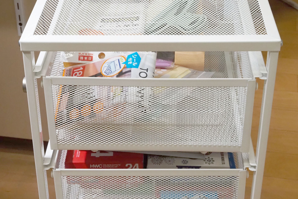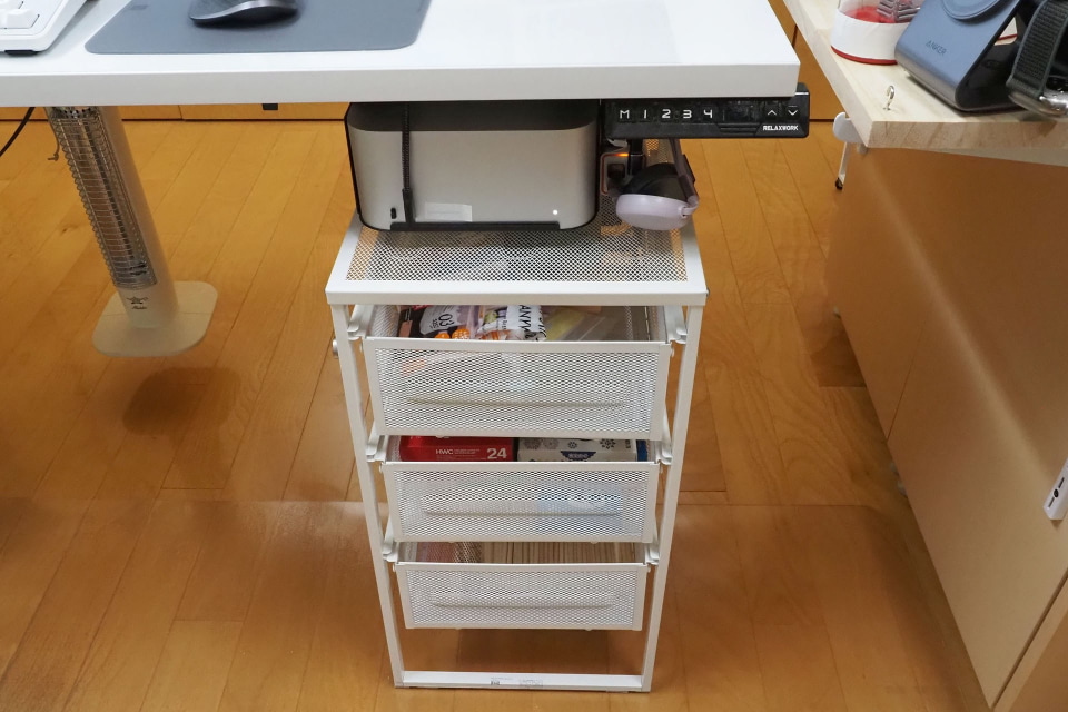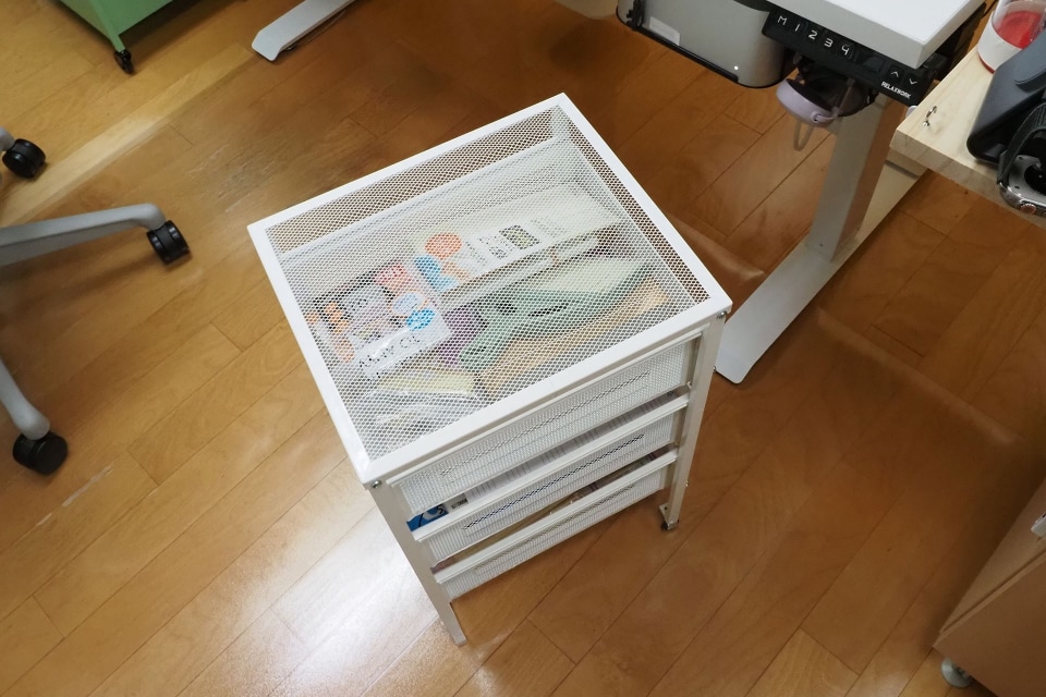 引き出しユニットの最初の1台目を使ってしばらく経って、とくに問題が起きないので、「こういう構造でも大丈夫なんだー」と追加で2台購入した。これも仕事机の周囲で使っているが、いや~引き出しが十分な数あると、ちゃんとしまえるモノが増えてスッキリと片付いてイイ感じ。また、引き出しはメッシュでありかつ上部が軽く開いているので、パッと見でなかになにが入っているかもよくわかる。これで直販価格1999円は満足感高いっすわ~。