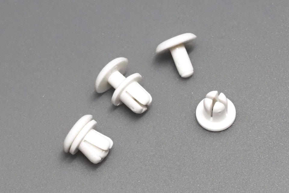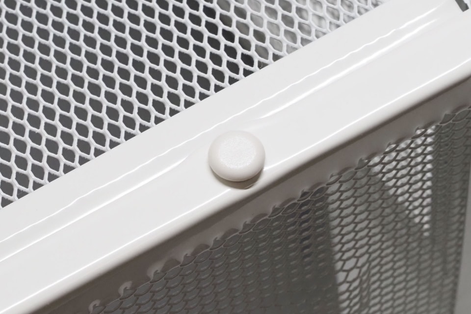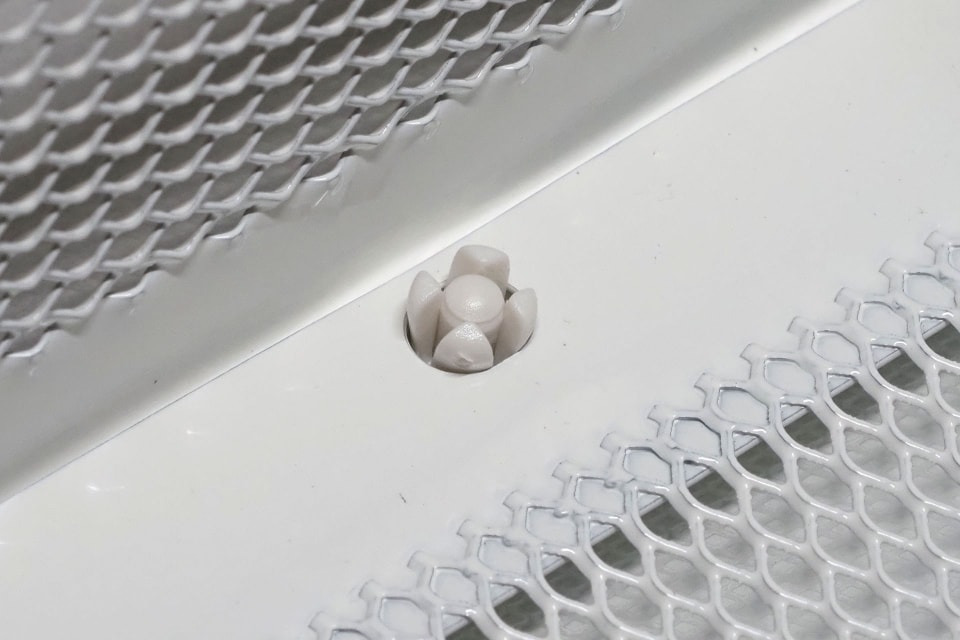 このユニットは組み立て式。主要なフレームどうしはネジ止めするが、引き出し部分はメッシュプレートを「手で折り曲げて」から「プッシュピン」のようなもので固定する「だけ」。プッシュピンは樹脂製で、クルマの内装固定などで使われる「プッシュリベット」や「クリップ」と呼ばれる「押し込んで止める」という固定方式が採用されている。詳しくは製品の組み立て説明書にあるとおり。