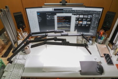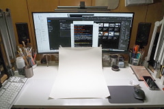 その環境でOM-5で撮って、あとはiPhoneに写真転送してMac上のPhotoshopでいろいろ処理する感じ。原稿終えたら机上少し片付けて紙敷いて、デスクに設置しているライトを引き出して、OM-5でチャチャッと撮影。とてもラク。