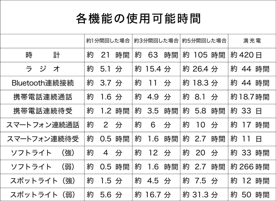 手回し発電を行う場合、1秒間に2回転のペースでハンドルを回して発電・充電する。何回くらい回すと、どのくらいの電気が使えるようになるの? それは以下の表のとおり。